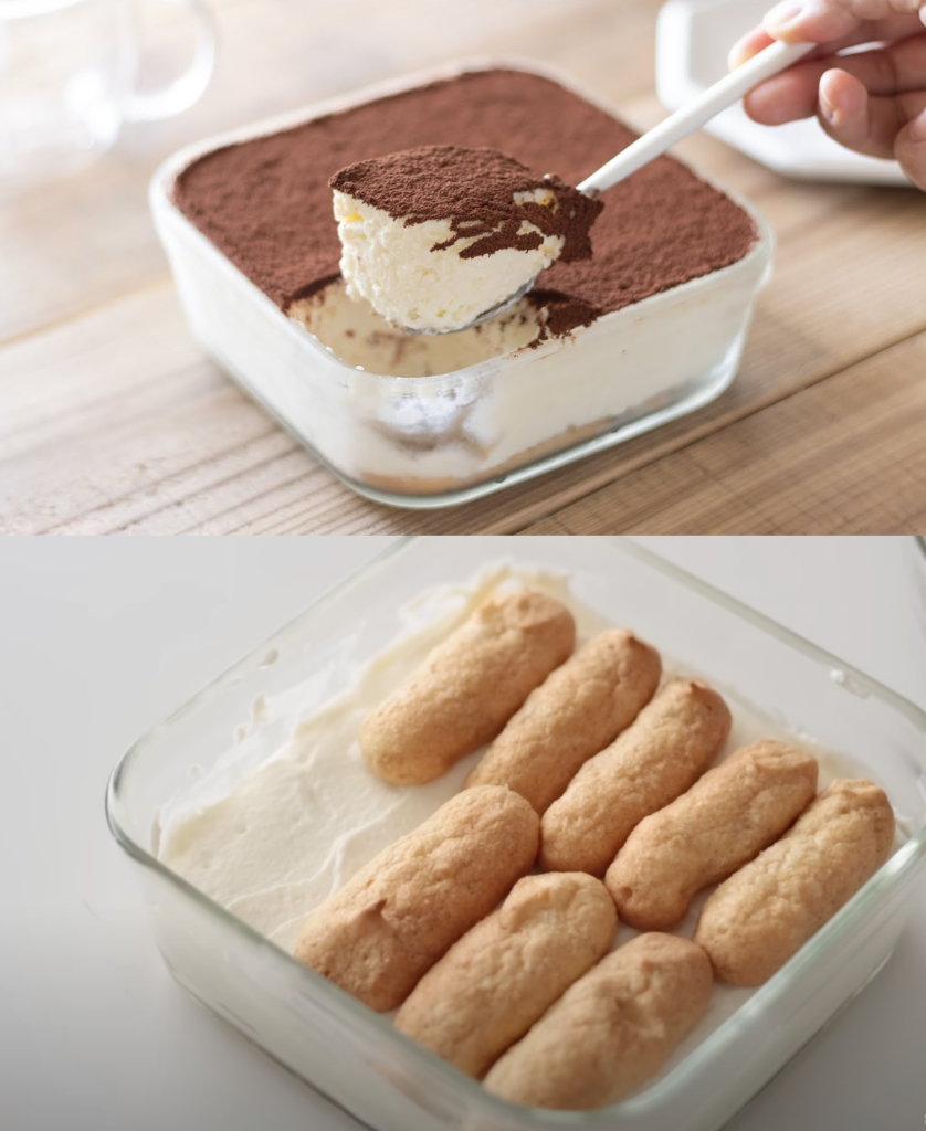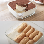 • Sestavení dezertu: Piškoty namáčejte do vychladlé kávy a vrstvěte je na dno formy. Na každou vrstvu piškotů naneste krém, střídavě s piškoty, dokud nevyčerpáte všechny ingredience. Na závěr uhlazujte povrch a posypte kakaem.