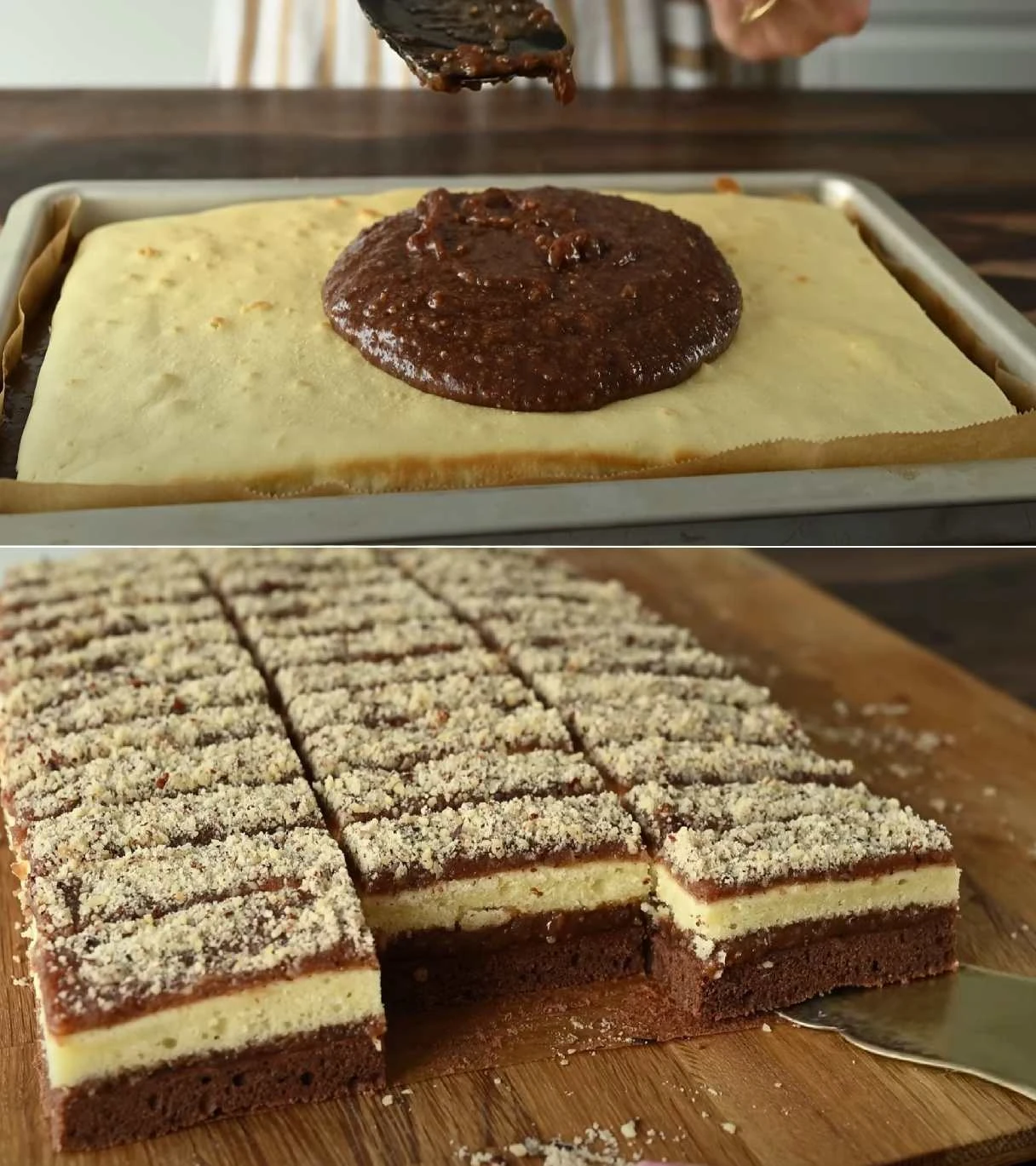 • Těsto: Bílky vyšlehejte se špetkou soli na tuhý sníh. Máslo vyšlehejte s cukrem do pěny, postupně zašlehejte žloutky a mléko. Mouku smíchejte s práškem do pečiva a vmíchejte do máslové směsi. Nakonec lehce zapracujte sníh z bílků. Polovinu těsta rozetřete na plech s pečicím papírem a pečte při 180 °C asi 10 minut dozlatova. Druhou polovinu těsta obohaťte o kakao, rozetřete na plech a upečte stejně. Oba pláty nechte vychladnout.