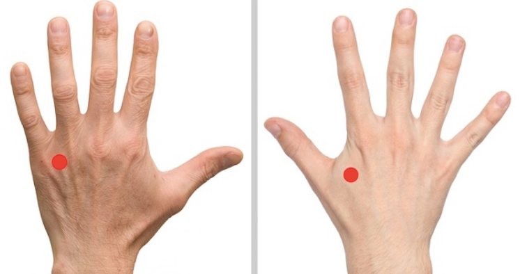 Poslední akupresurní bod pro potlačení bolestí krku se nachází na hřbetu ruky mezi palcem a ukazováčkem (dolní obrázek vpravo).