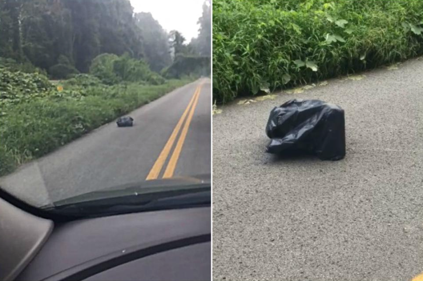 Do práce mířila poměrně úzkou cestou a najednou si všimla, že uprostřed její cesty leží černý pytel. Původně chtěla tento černý pytel žena obloukem obejít, ale černý pytel se začal hýbat.